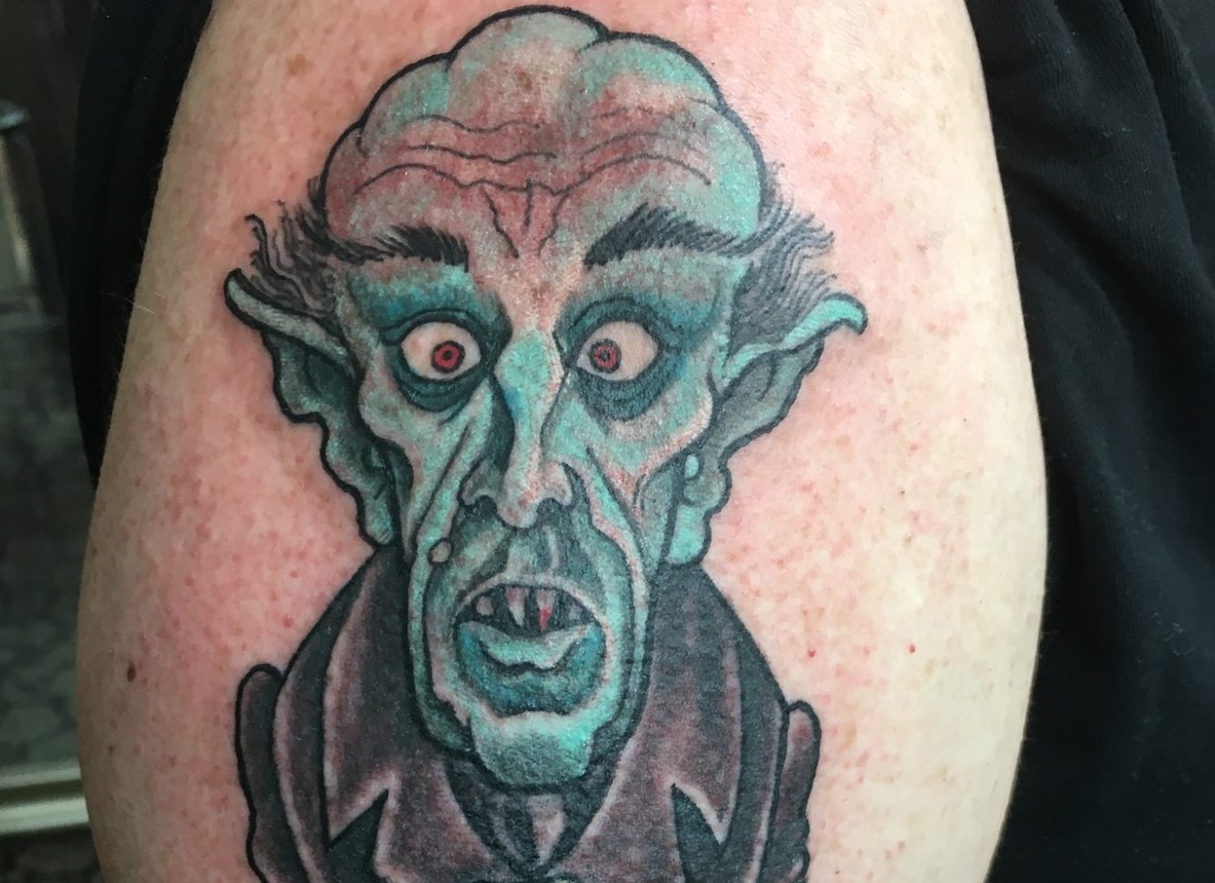 Als Beispiel für einen Drachen am Oberarm mit Farbe mit schwarz/grauen Hintergrund: